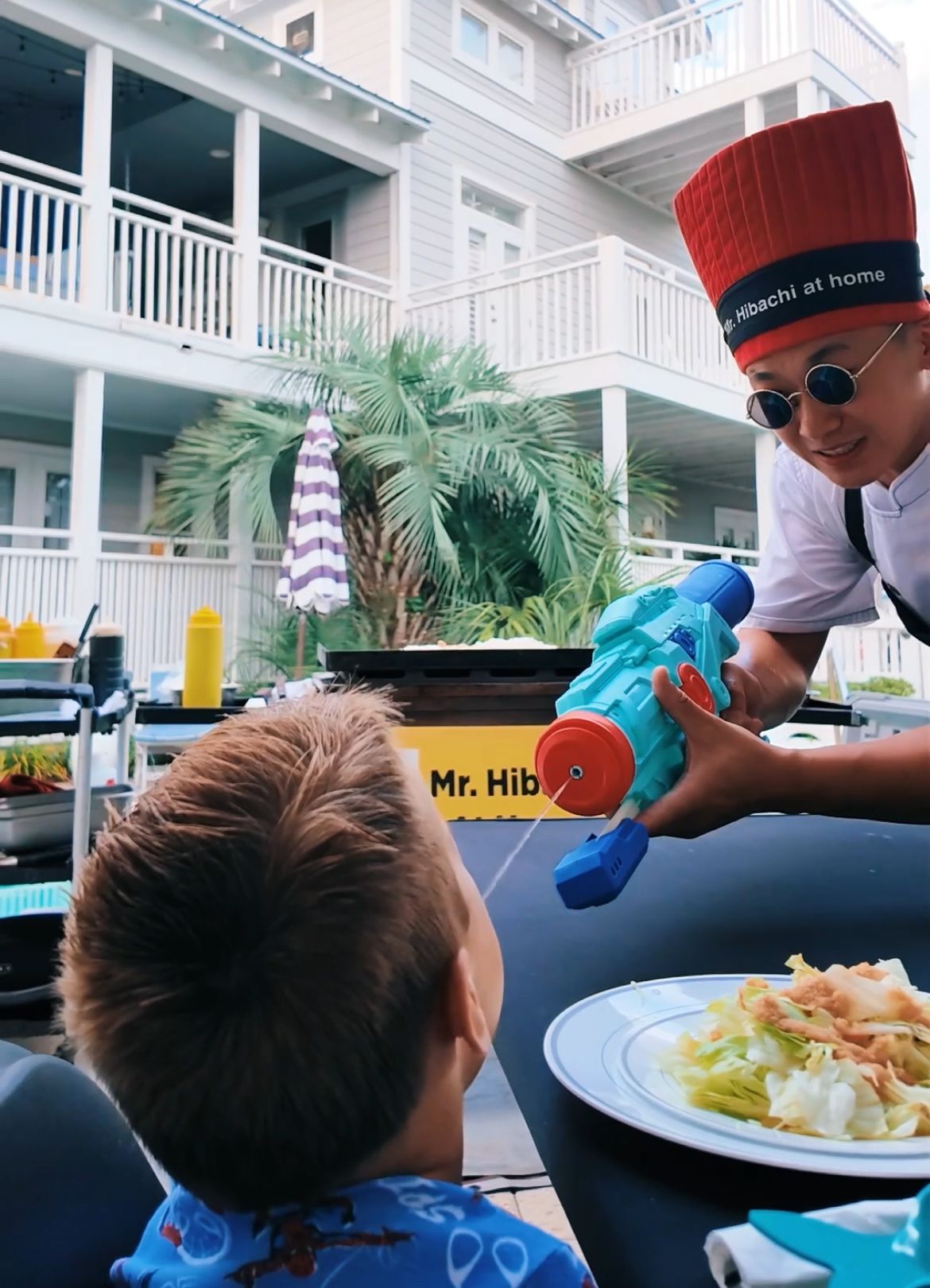 Mr. Hibachi at Home is also a big hit with kids and adults. The food is great and they keep kids (and adults) entertained for the entire dinner. It's so convenient since they come to your vacation rental. They are known for their sake filled water guns, but also have have a kid friendly option so the kids can join in on the fun.