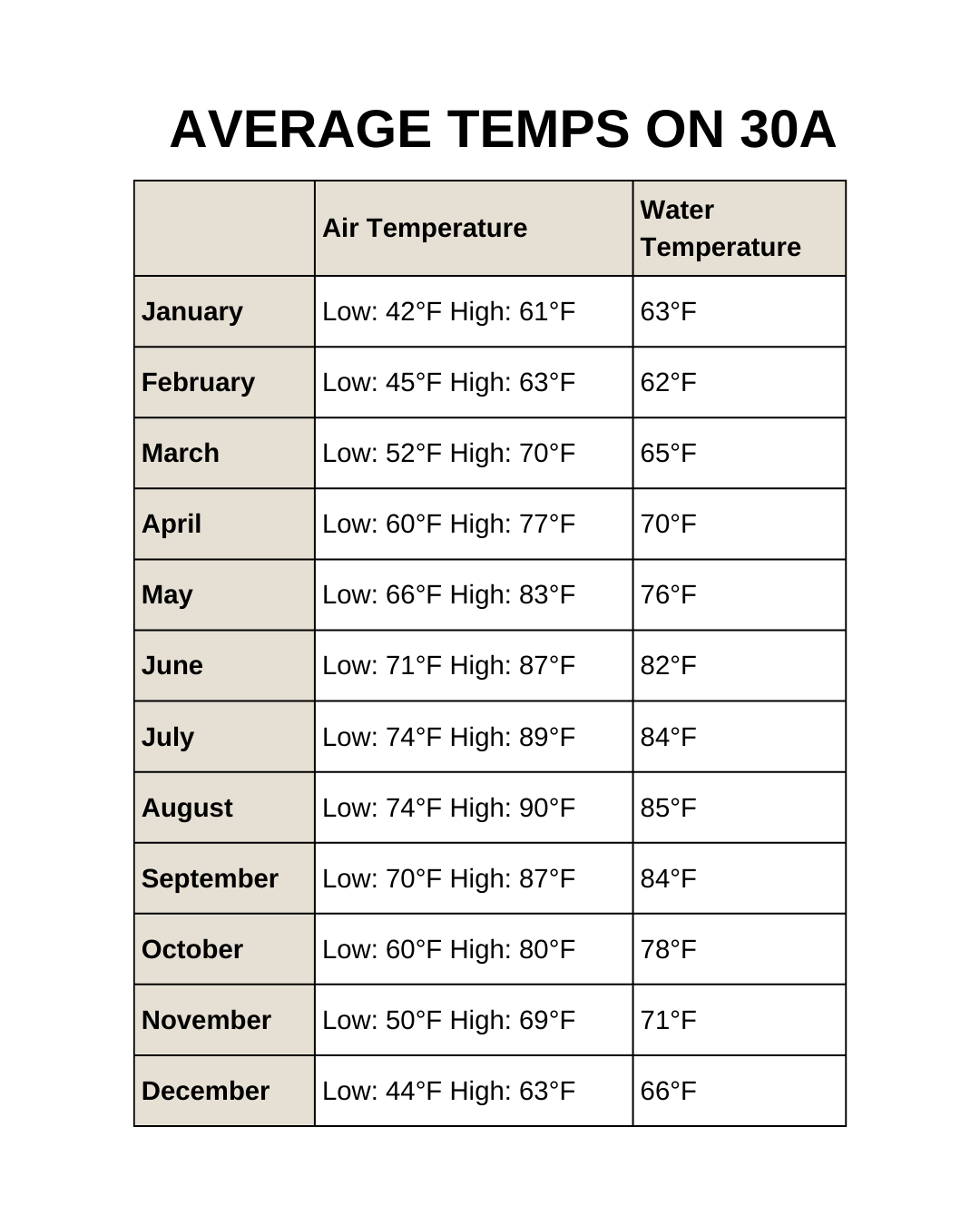 When is Peak Season? End of May, June, July and the beginning of August when school is out for summer. My favorite months: August, September, and October. If you are curious about 30A weather, see the chart below!