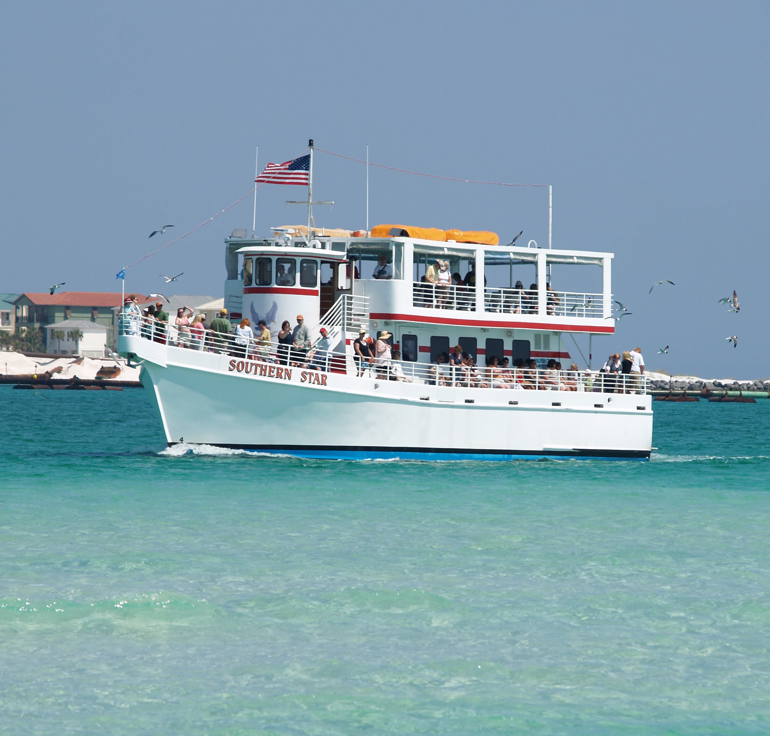 Hop aboard Destin’s Original Dolphin Cruise on the Southern Star, with a 98% success rate for dolphin sightings. The double-decker, glass-bottom boat offers unbeatable views, shaded seating, AC, and a full galley with food, beer, and wine.